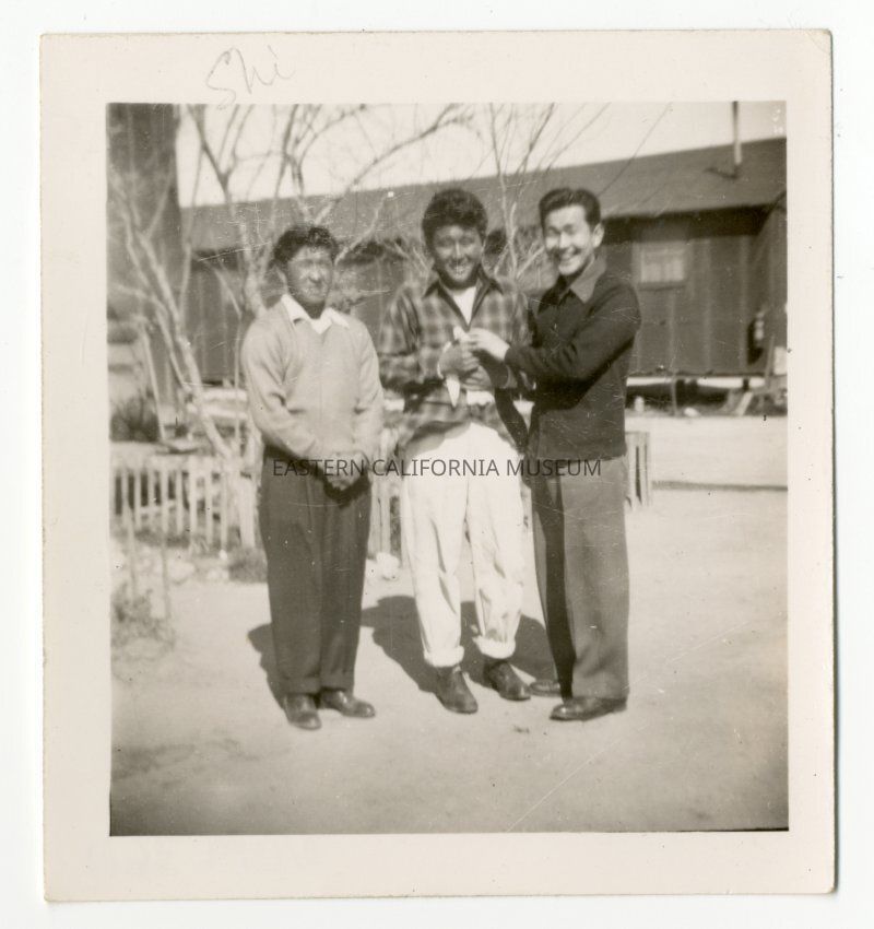 From Louie Sakamoto's photos. Exterior photo of three men in front of a barrack. Someone has written "Shi" along the top edge of photo.Photograph Details