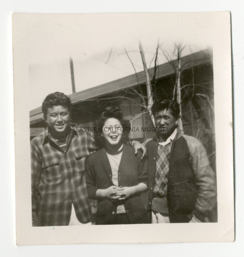 From Louie Sakamoto's photos. Exterior photo of three people in front of a barrack.Photograph Details