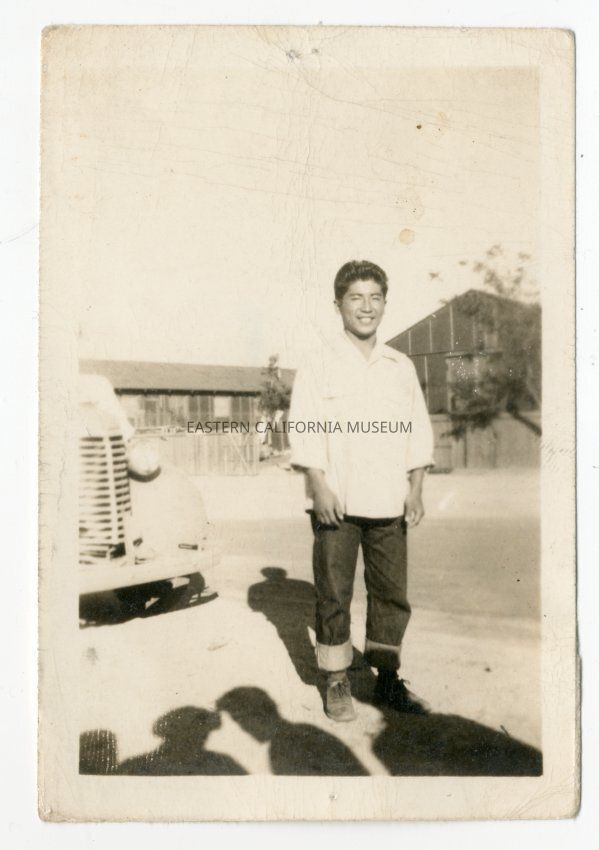 From Louie Sakamoto's photos. Exterior photo of a man standing in front of a barrack. There is a partially visible vehicle behind him.Photograph Details