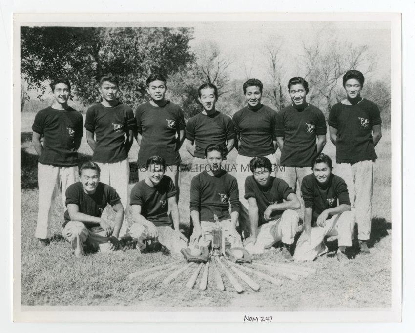 Exterior photograph of twelve men in two rows, with the front row kneeling on the grass. The men are the "Manzaknights" baseball team, and are wearing dark shirts with the club logo on the front. In front of the men on the ground are baseball bats displayed in a fan shape along with mitts and balls. The Manzaknights were League Champs in 1943.Photograph Details