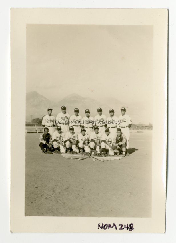 Exterior photograph of fourteen young men in two rows, with the front row kneeling or crouching. Twelve of them are wearing baseball uniforms with the name "Knights" on the front, and baseball caps with the letters "MK" (Manzaknights) on the front. Two are not wearing uniforms, but are wearing Manzaknight jackets. In front of the men on the ground is a fan shaped display of twelve baseball bats and some mitts. In the background are some barracks, and the Sierra behind them. A label beneath the photo identifies the team as "43 Knights Team."Photograph Details