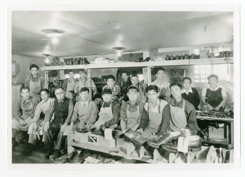 Interior photo of the shoe repair shop at Manzanar War Relocation Center. Shi Nomura's father, Hachizo Nomura, was the manager. It was located in Block 3.Photograph Details