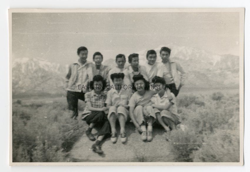 From Cabby Iwasaki's photo collection. Exterior photograph of 6 men standing with 4 women sitting in front of them all facing the camera. They are outside the Manzanar fence on the south side of the camp. Cabby Iwasaki is identified as third from the left in the back row. The Sierra are visible behind the group.