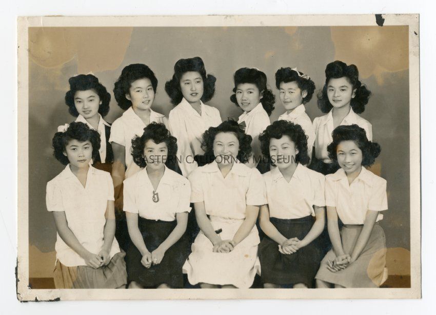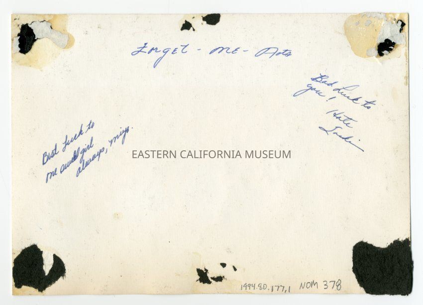 Interior photograph of eleven women in two rows. The women are part of the social club "forget-me-nots", and are named on a label adjacent to photo. In the front row, left to right, Toshiko Akimoto, Grace Araishi, Harumi Hino (Advisor), Michi Yoshimoto, Mary Honda. In the back row, left to right, Aya Nishi, Betty Yamada, Mary Matsuno, Cheri Yamada, Yuki Shigemori, Miyo Nishi. On the back of the photo is written in ink "Forget-me-nots," "Best Luck to one swell girl, Always, Miyo," and "Bad Luck to you! Hate, Toshi."Photograph Details