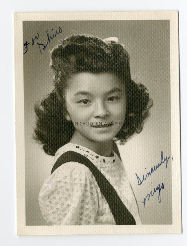 Studio portrait of Miyo Nishi, a member of the Forget-Me-Nots at Manzanar. Written on the photo in ink is "For Shiro, Sincerely, Miyo."Collection