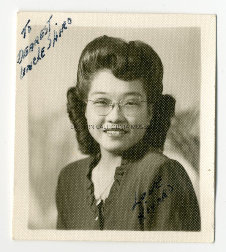 Studio portrait of Kiyoko Nishi, a member of the Forget-Me-Nots at Manzanar. Written in ink on the photo is "To Dearest Uncle Shiro, Love, Kiyoko."Collection