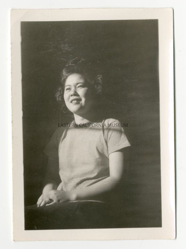 Portrait photo of a young woman sitting in front of a dark wall that is mostly hidden in shadow. This is possibly Michi Yoshimoto, a member of the Forget-Me-Nots.Collection
