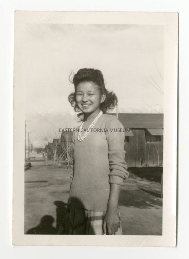 Exterior photograph of a young woman standing with several barracks building in the background. Woman is a member of the Forget-Me-Nots.Photograph Details