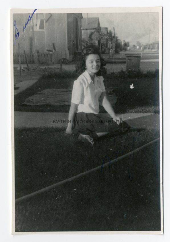 From Cabby Iwasaki's photo collection. Photo of Miyo Nishi sitting on grass with a sidewalk and barracks buildings in the background. Written in ink on the photo is "Sus" and "Miyo." Miyo is a member of the Forget-Me-Nots.