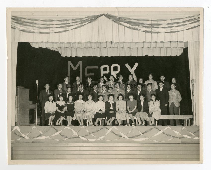Photo of 24 men and 11 women on stage at Manzanar Auditorium. Label: "CHRISTMAS 1943." Mary Kageyama (Nomura) is seated fifth from the left in the front row of women.Photograph Details