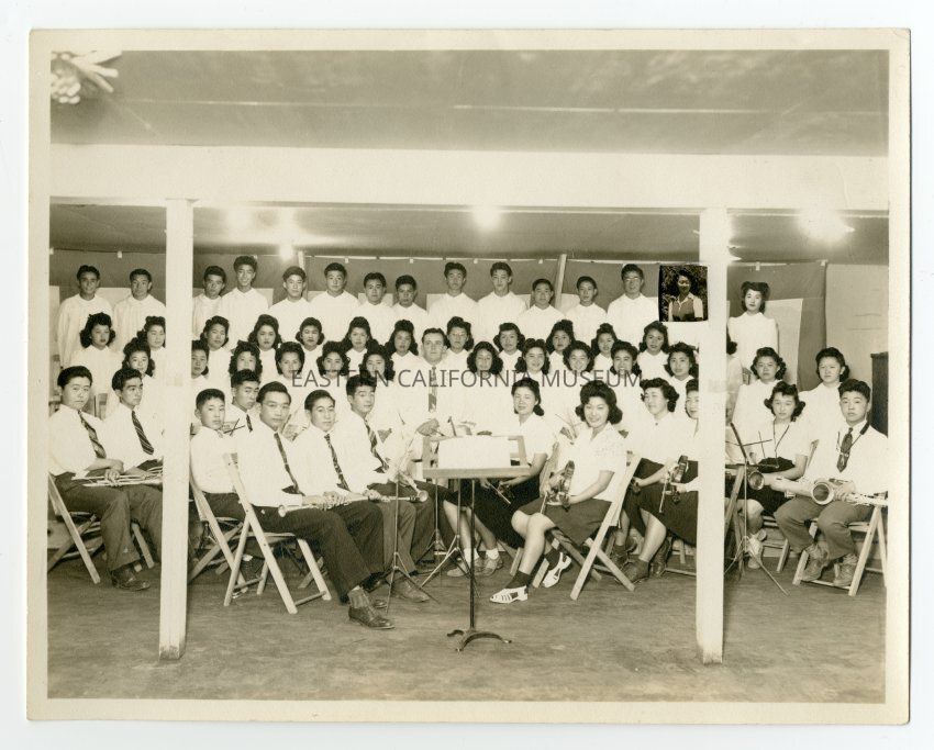 Photograph labeled "Manzanar Hi. Glee Club & Orchestra." Seated in front of photo are 14 young men and women with musical instruments including violin, clarinet, trumpet, and saxophone. Standing behind the musicians are 40 students wearing choir robes. In the middle of the photo is Music Director Louis Frizzell. Mary Kageyama (Nomura) is pictured in a photo inserted into the back row of the choir through a hole cut in the larger photo.Photograph Details