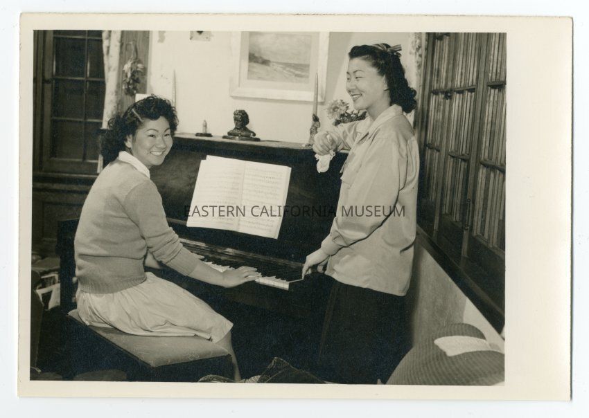 Interior photograph of a young woman seated at a piano with another young woman, Mary Kageyama (Nomura) standing next her. The label beneath the photo identifies the location as "Pasadena Friends Church Hostel '45." This is where Mary Kageyama moved when she left Manzanar in early 1945.