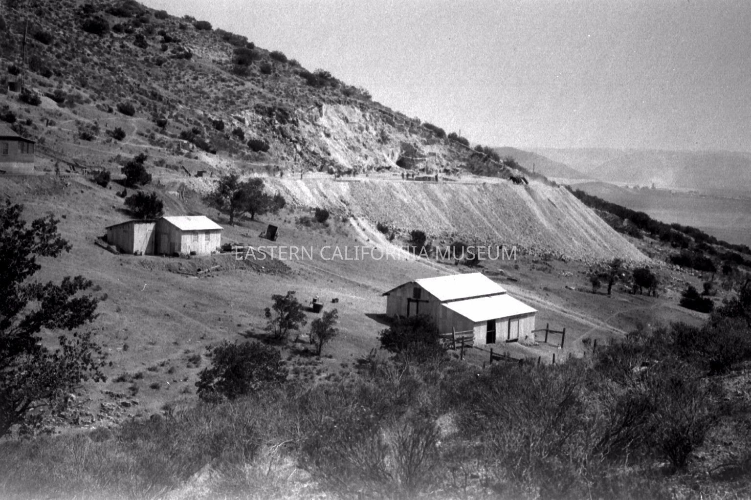 B & W digital scan of LADWP Limestone (Tufa) Mine. Note Monolith Cement Plant in right center of image where limestone was converted into cement for LA Aqueduct Construction.Collection