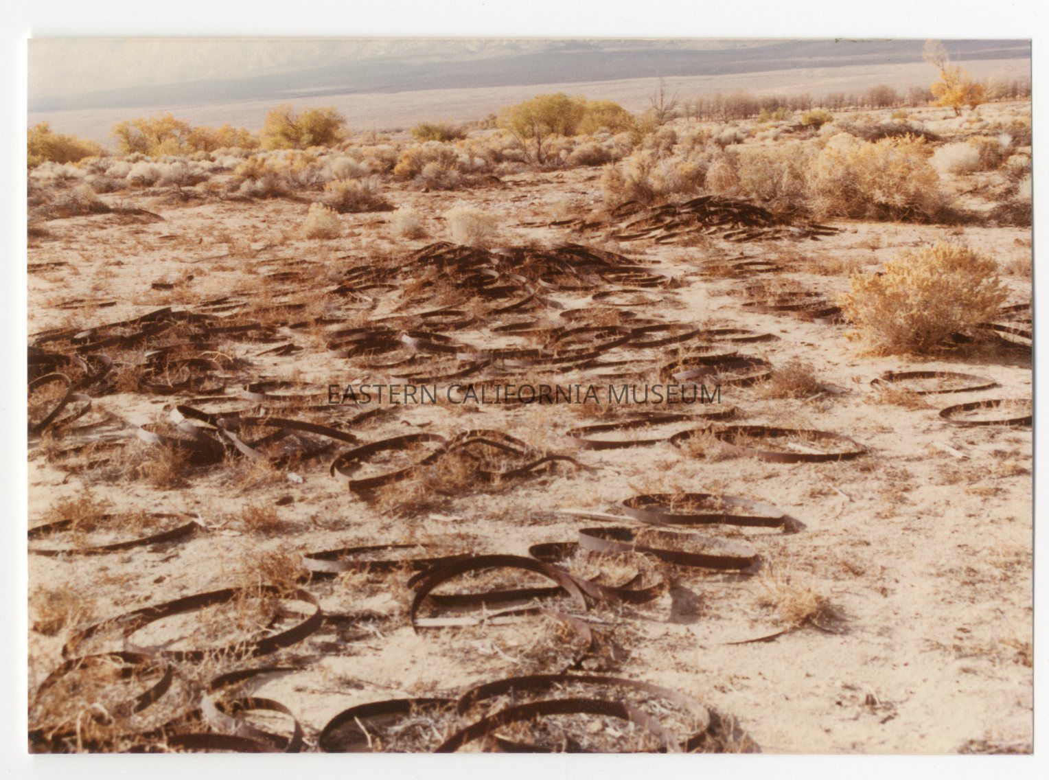 Color photo of lots of rusty metal rings (from barrels?) at Manzanar.