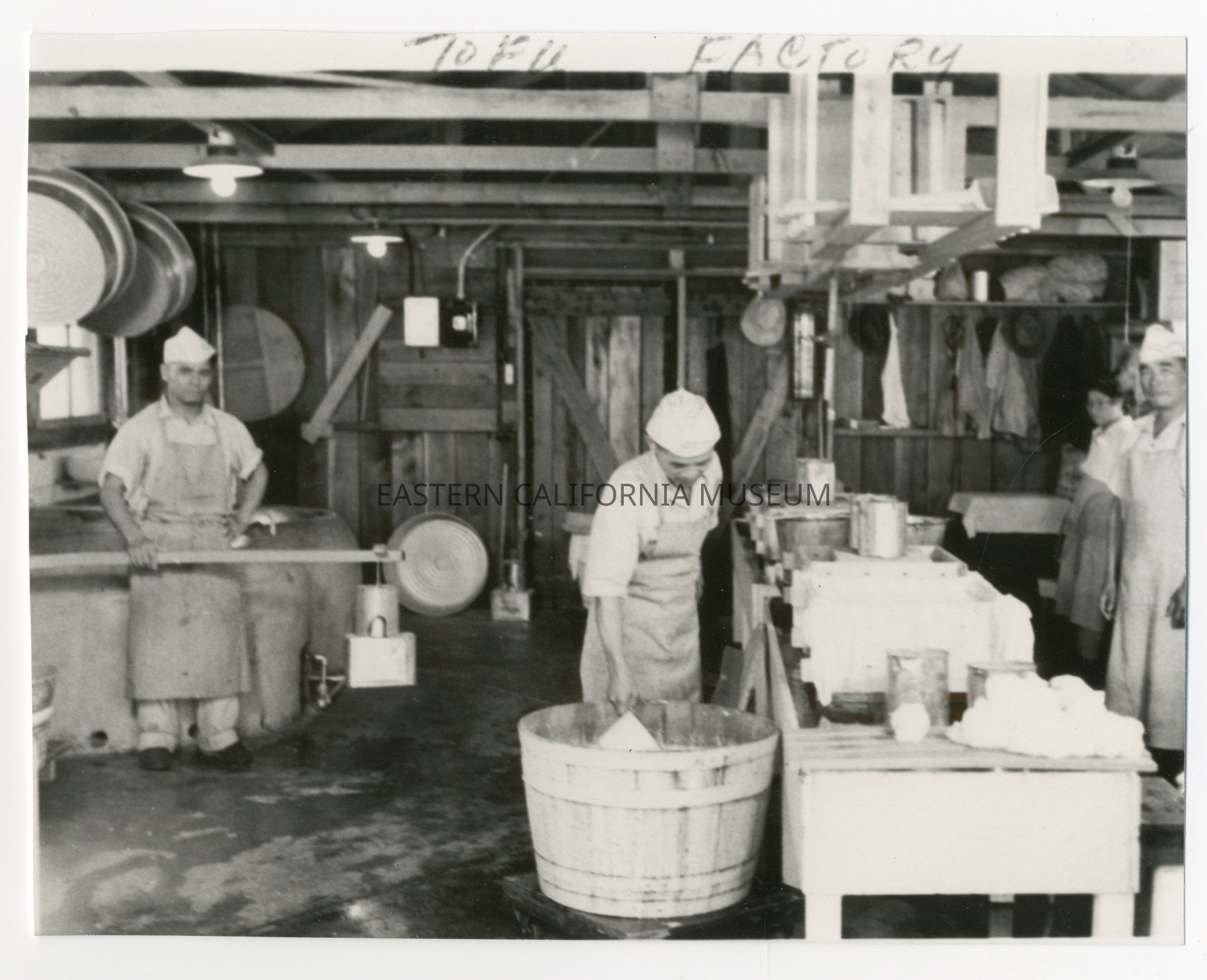 Copy of a photo of three men (and one more person in the background) inside a kitchen. It it labeled "Tofu Factory." This copy was printed in March 1984.Photograph Details