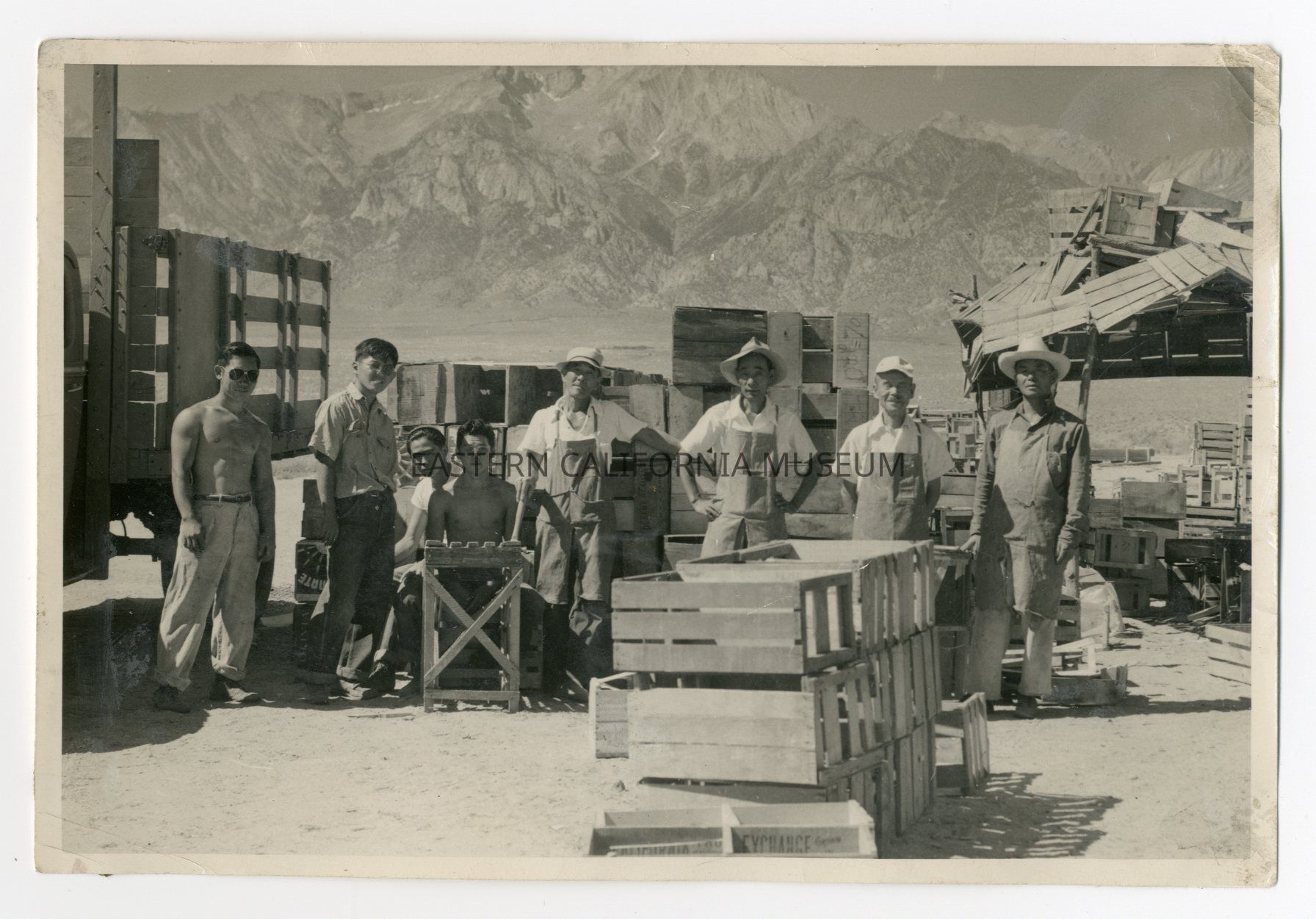 Photo of eight men standing outside with a pile of wood crates in the foreground.