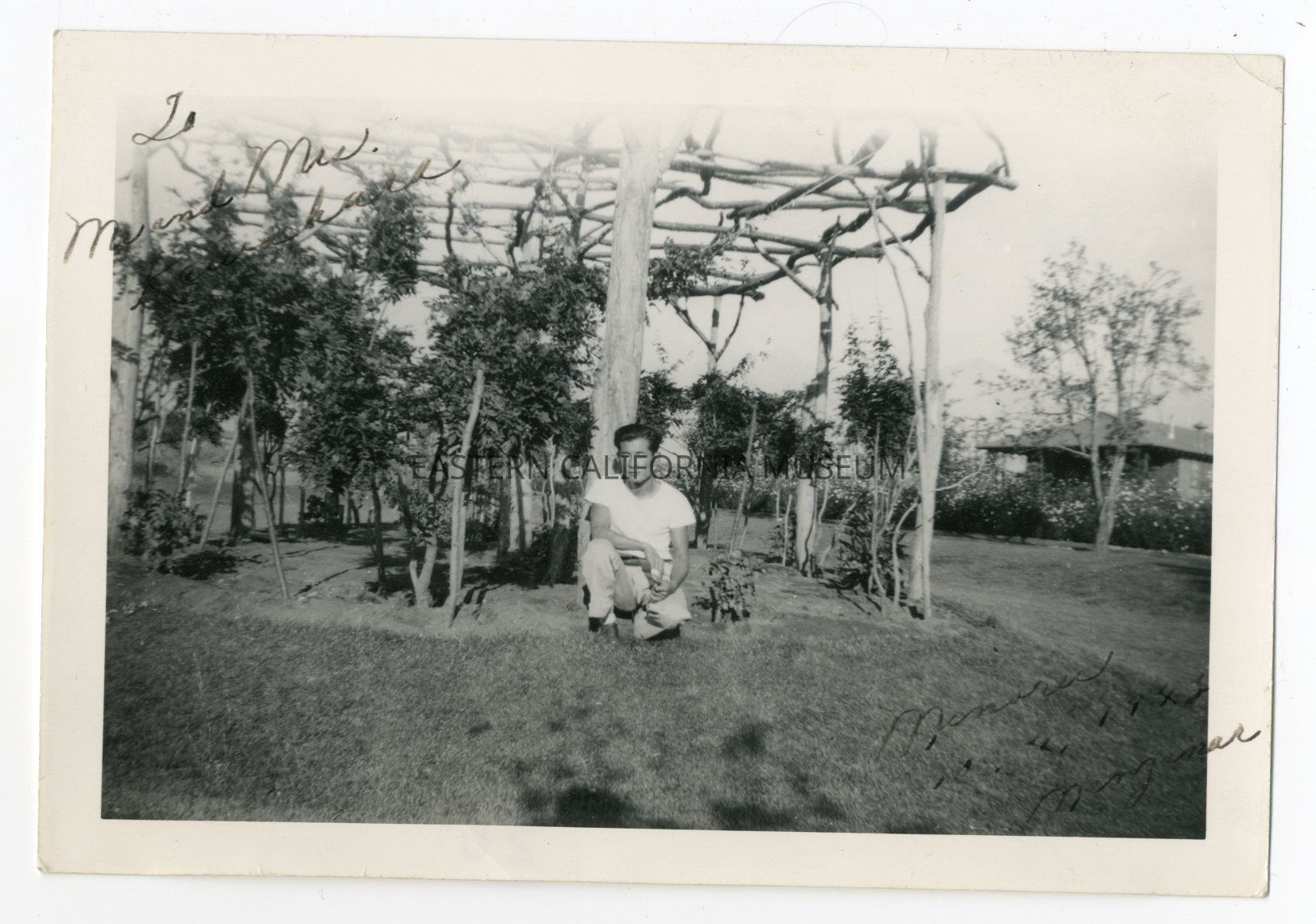 Photo of a man kneeling down by a trellis or pergola-like structure made from sticks. Written in black ink on front of image is "To Mr. and Mrs. Kawahara. Monuru, [illegible date] 1945, Manzanar.