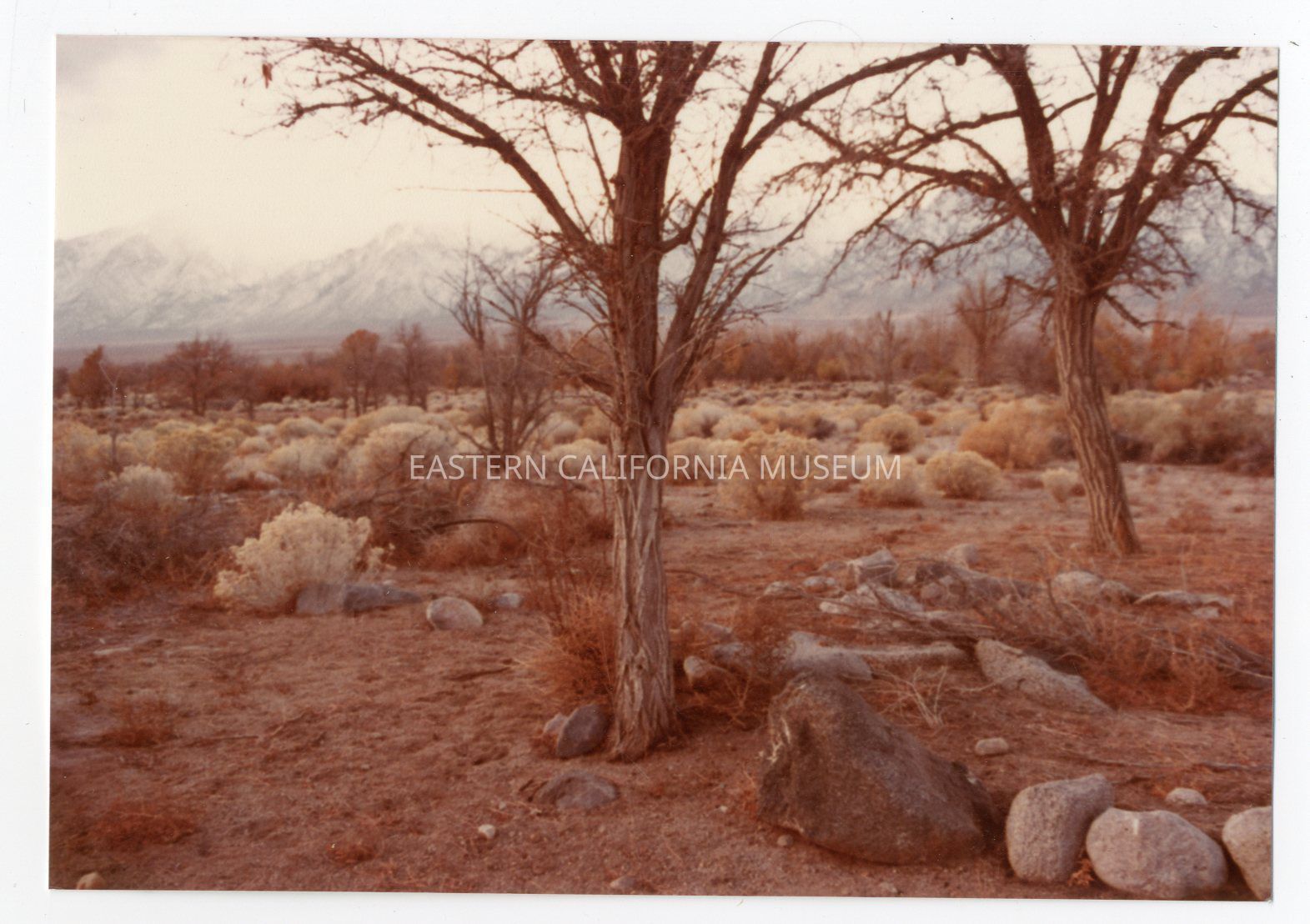 Color photo of trees, rocks, and mountains at Manzanar War Relocation Center.