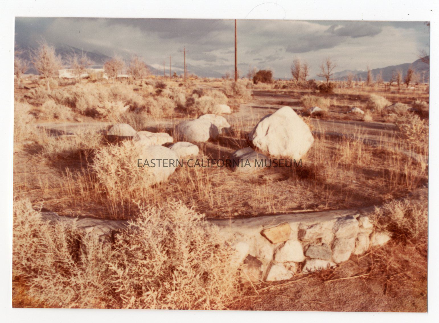 Color photo of remains of a rock and concrete wall at Manzanar War Relocation Center.