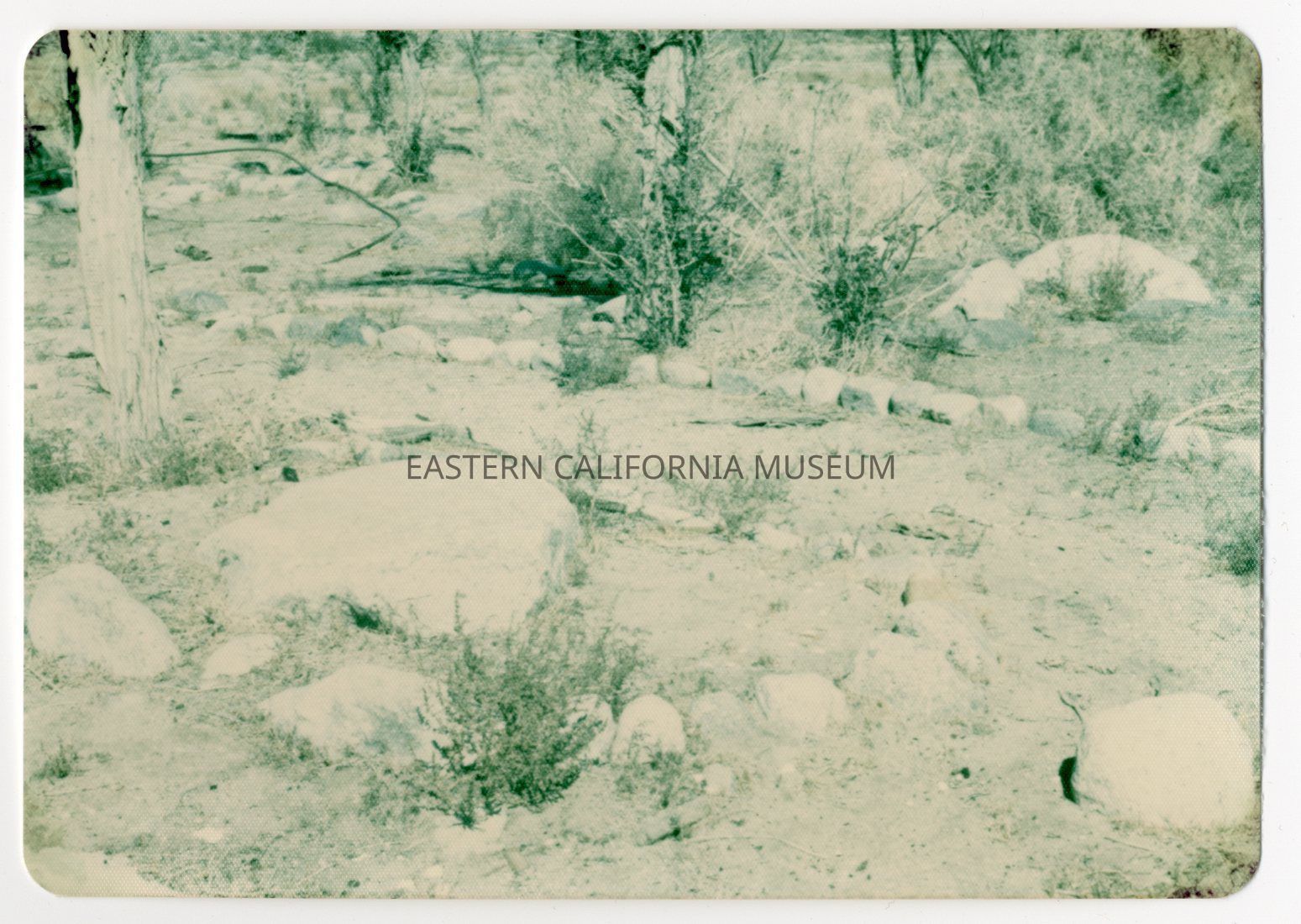 Color photo of a rock-lined dirt path at Manzanar War Relocation Center.Photograph Details