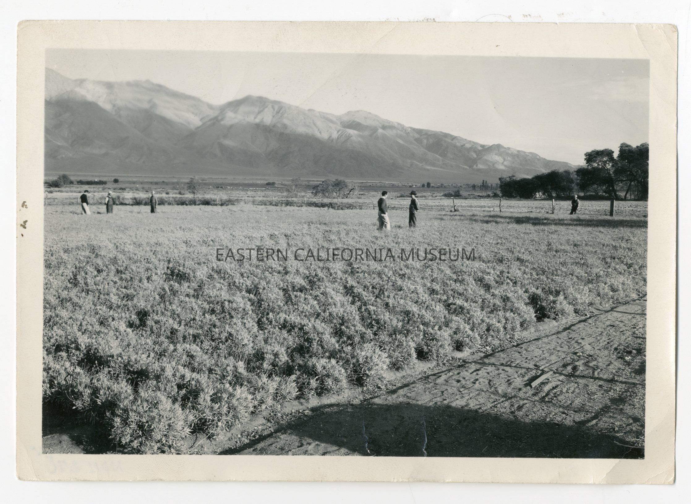 Photo of six people in a field (guayule?) at Manzanar War Relocation Center.