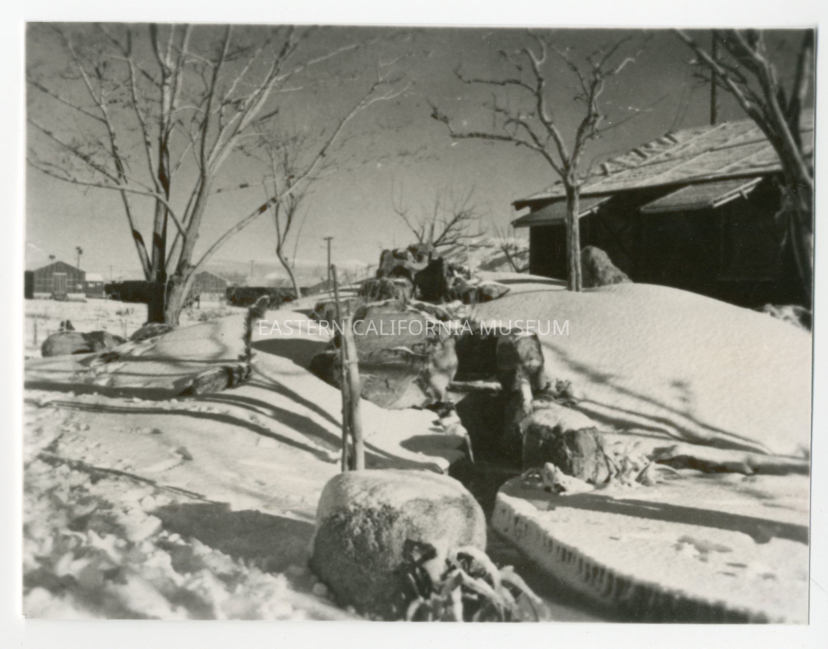 Copy of a photo of a water feature at Manzanar War Relocation Center covered in snow. Barracks are visible in background.