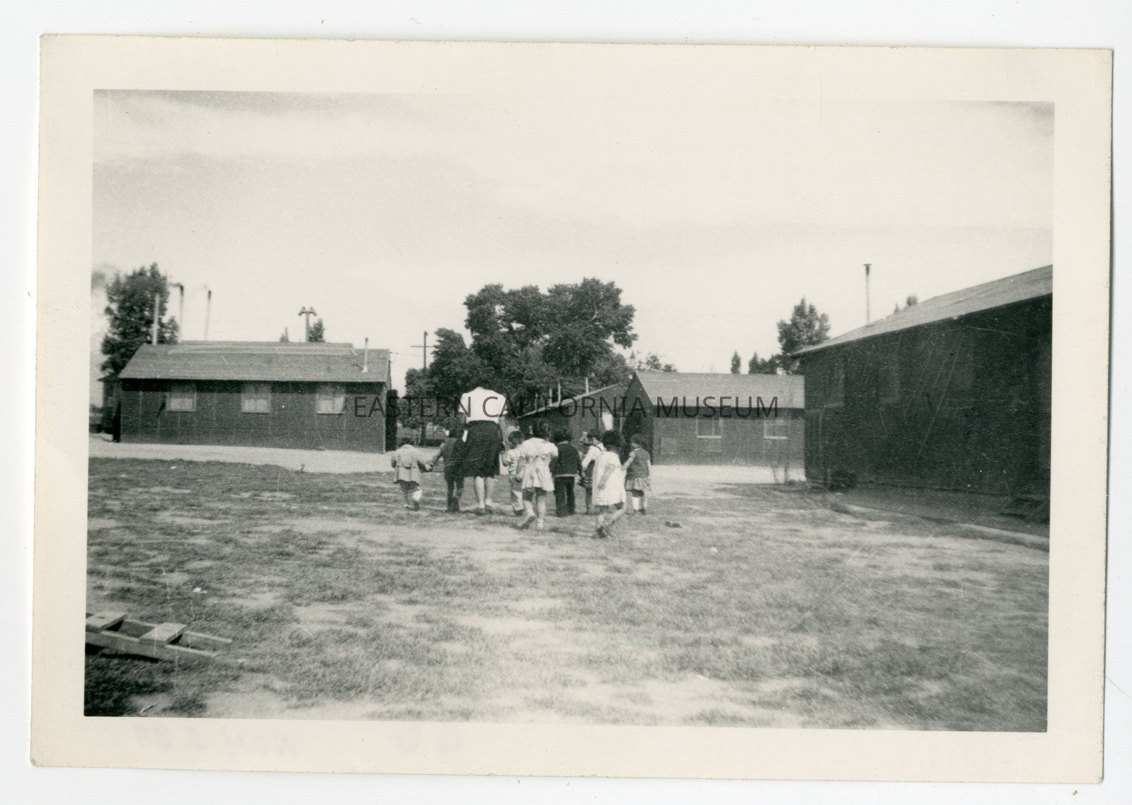 Photo of a woman, likely a teacher, leading a group of small children towards some barracks.