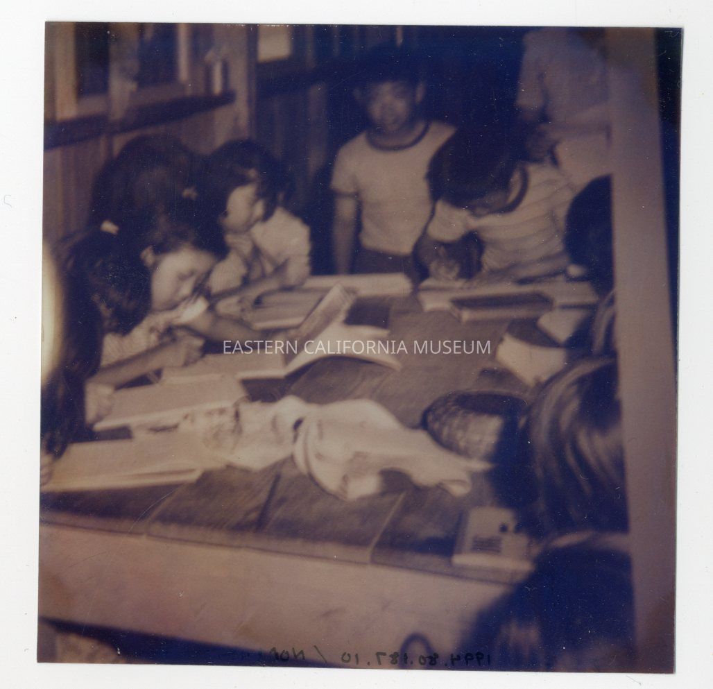 Copy of an interior photo of students sitting at a wood table inside a barrack at Manzanar War Relocation Center.Photograph Details