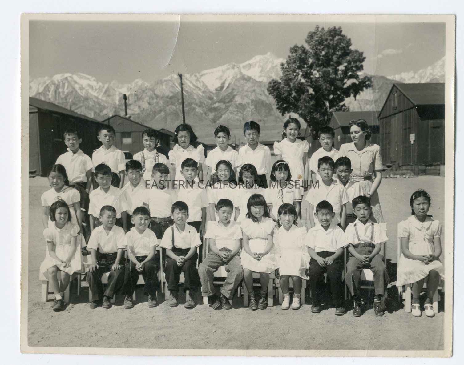 Exterior photo of 28 young students with a Caucasian teacher at Manzanar War Relocation Center. They are in three rows with barracks and the Sierra Nevada mountain range in the background.