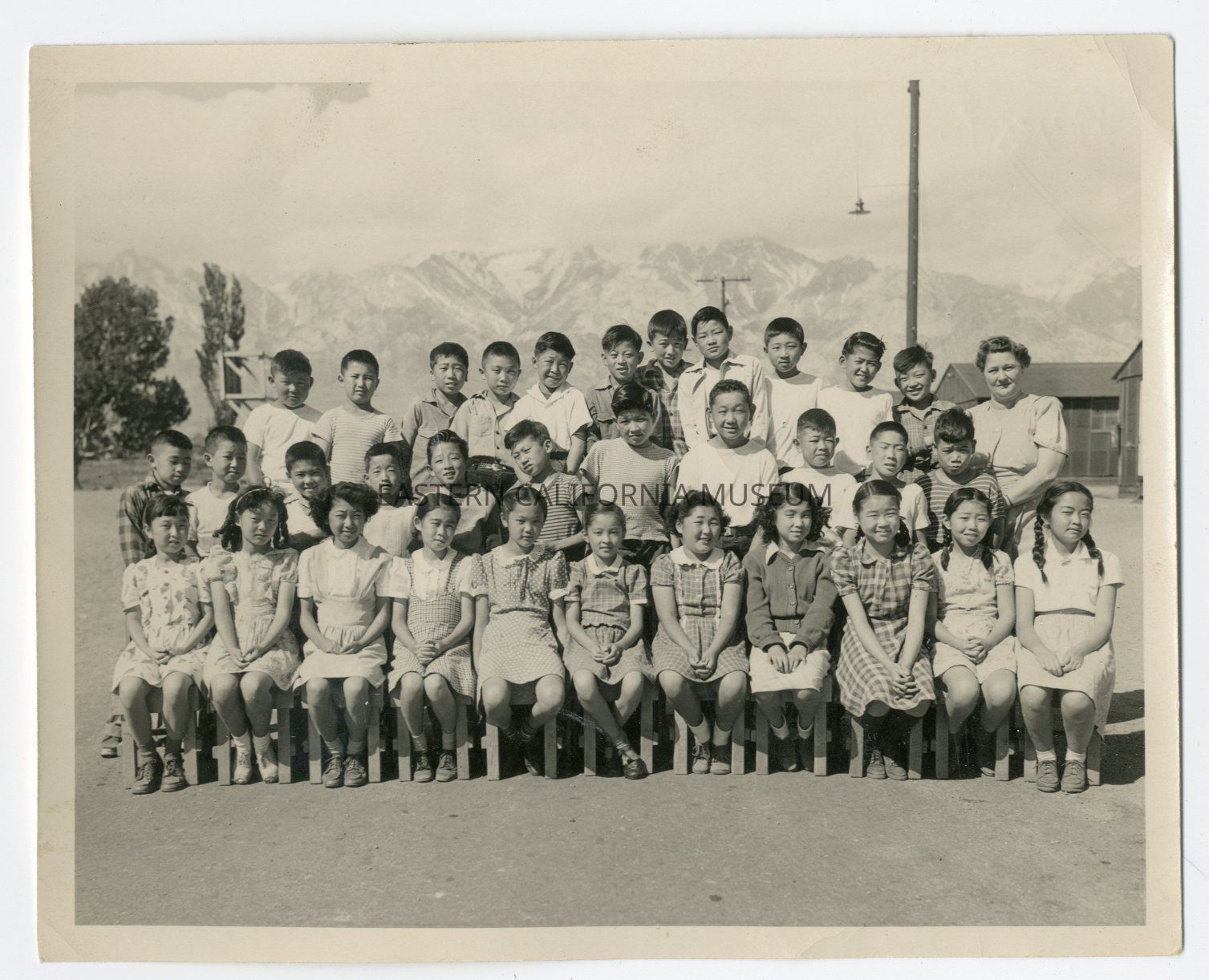 Exterior photo of 33 young students with a caucasian teacher at Manzanar War Relocation Center. They are in three rows with barracks and the Sierra Nevada mountain range in the background.
