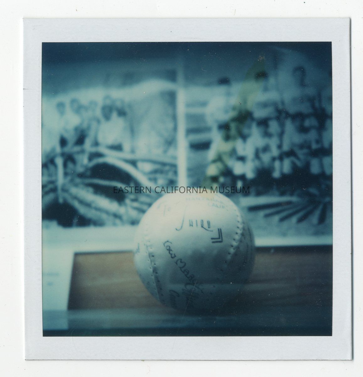 Color photo of a signed softball on display at the Eastern California Museum (1973.133.23). There are two photos in the background, one of the Manzaknights and the other of a group of people standing on a wooden bridge.Collection