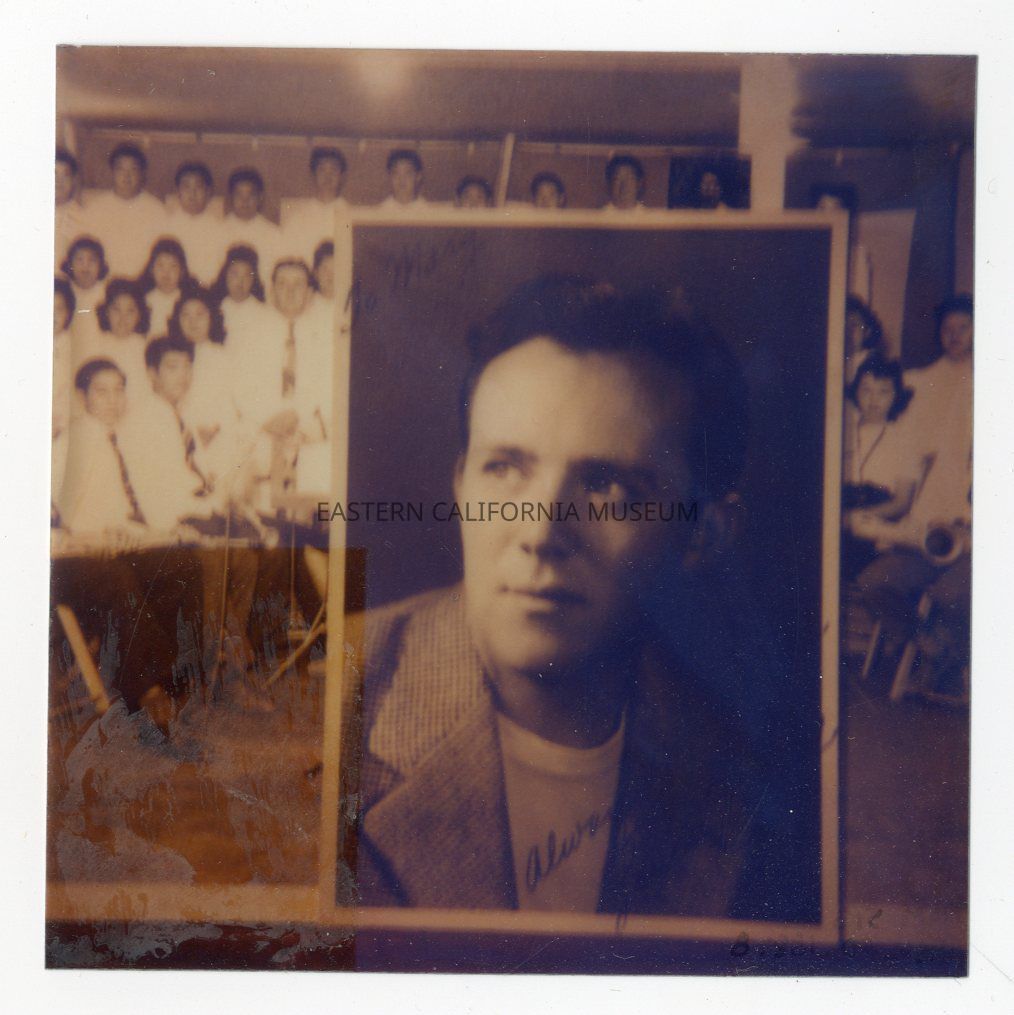 Photo taken of two other photos on display at the Eastern California Museum. The main photo is of Louis Frizzell, Jr. (1994.80.178e), and the photo behind it is of the Manzanar High School Glee Club and Orchestra at Manzanar War Relocation Center (1994.80.178f).