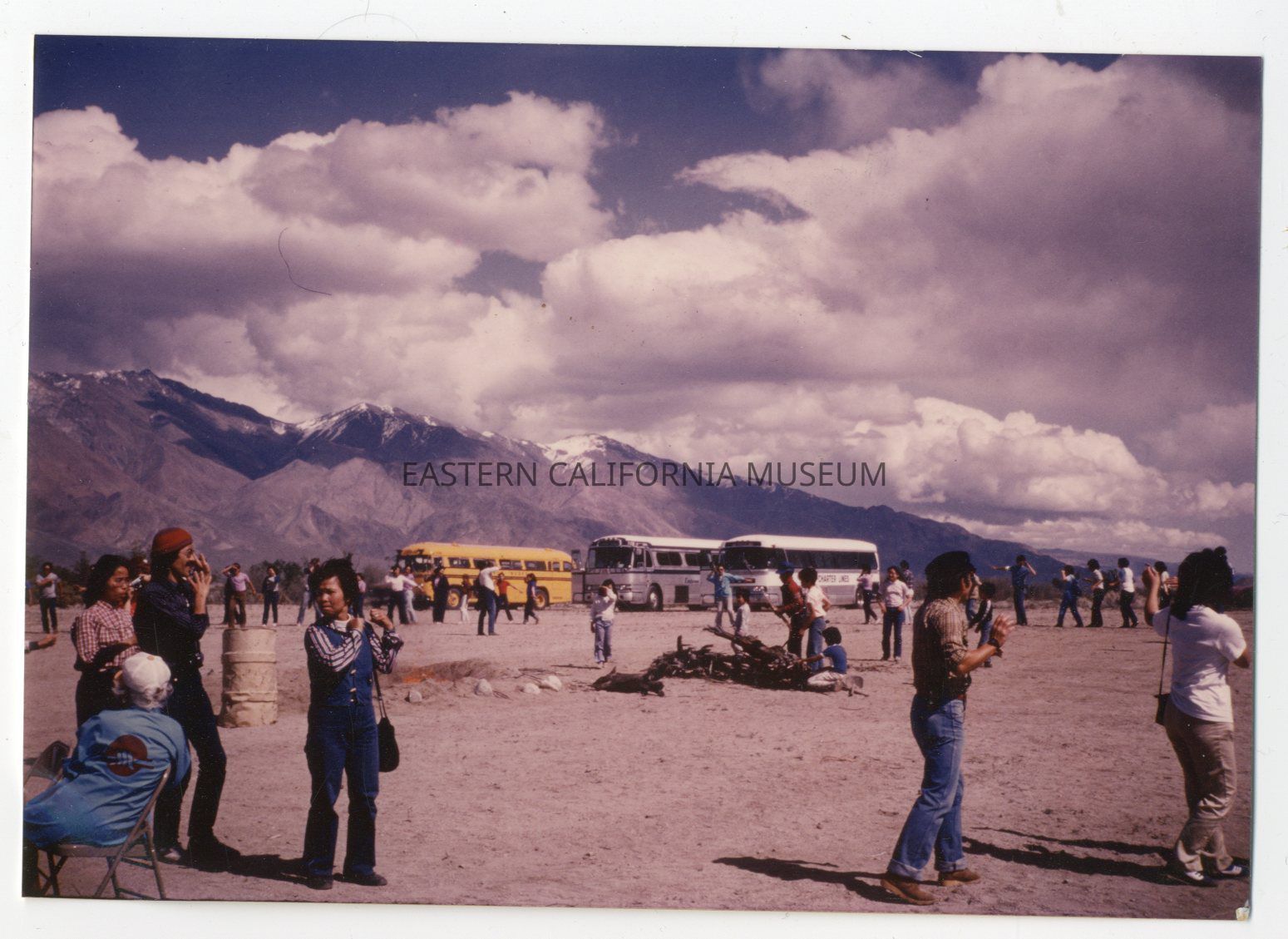Color photo of several people milling around on a dirt lot with at least three buses parked in the background. This photo was taken during a Manzanar Pilgrimage, likely in 1983. The photo was printed in March 1984.