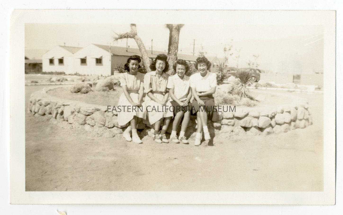 Photo of four young women sitting on the edge of a rock and concrete planter for a joshua tree at Manzanar War Relocation Center. Two long buildings are visible in the background--they don't look quite like barracks, maybe administration or caucasian quarters?Photograph Details