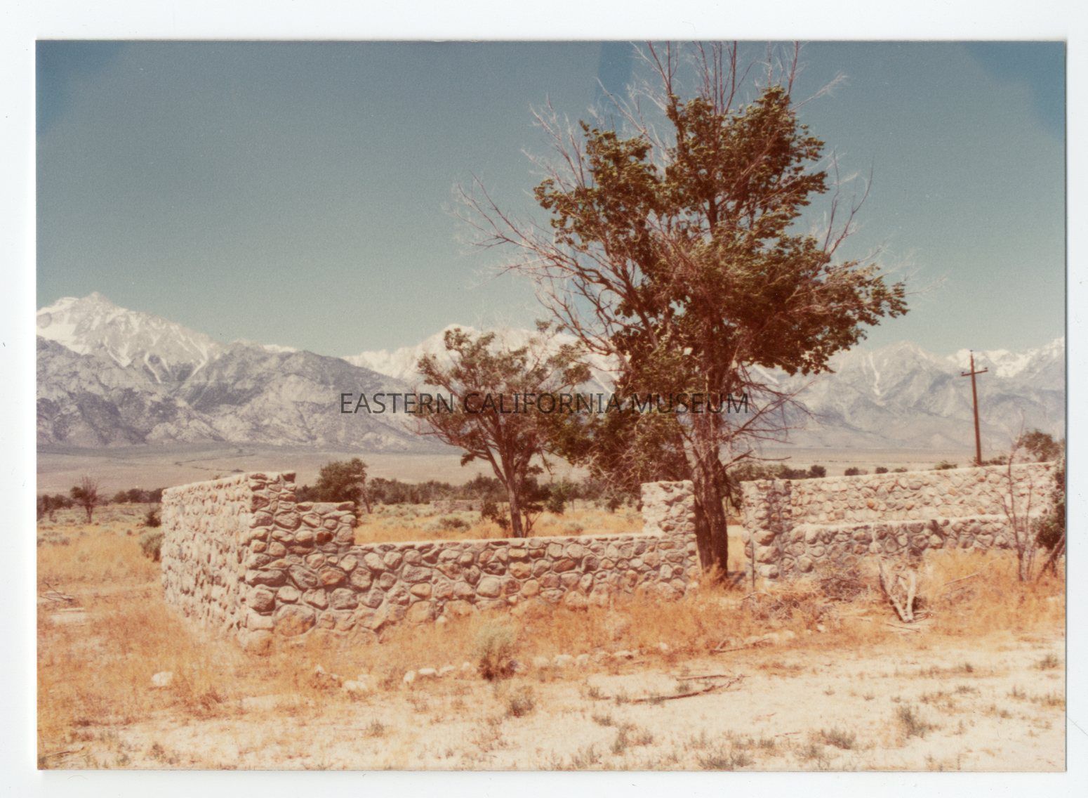 Color photo of the remains of a stone building at Manzanar.Photograph Details