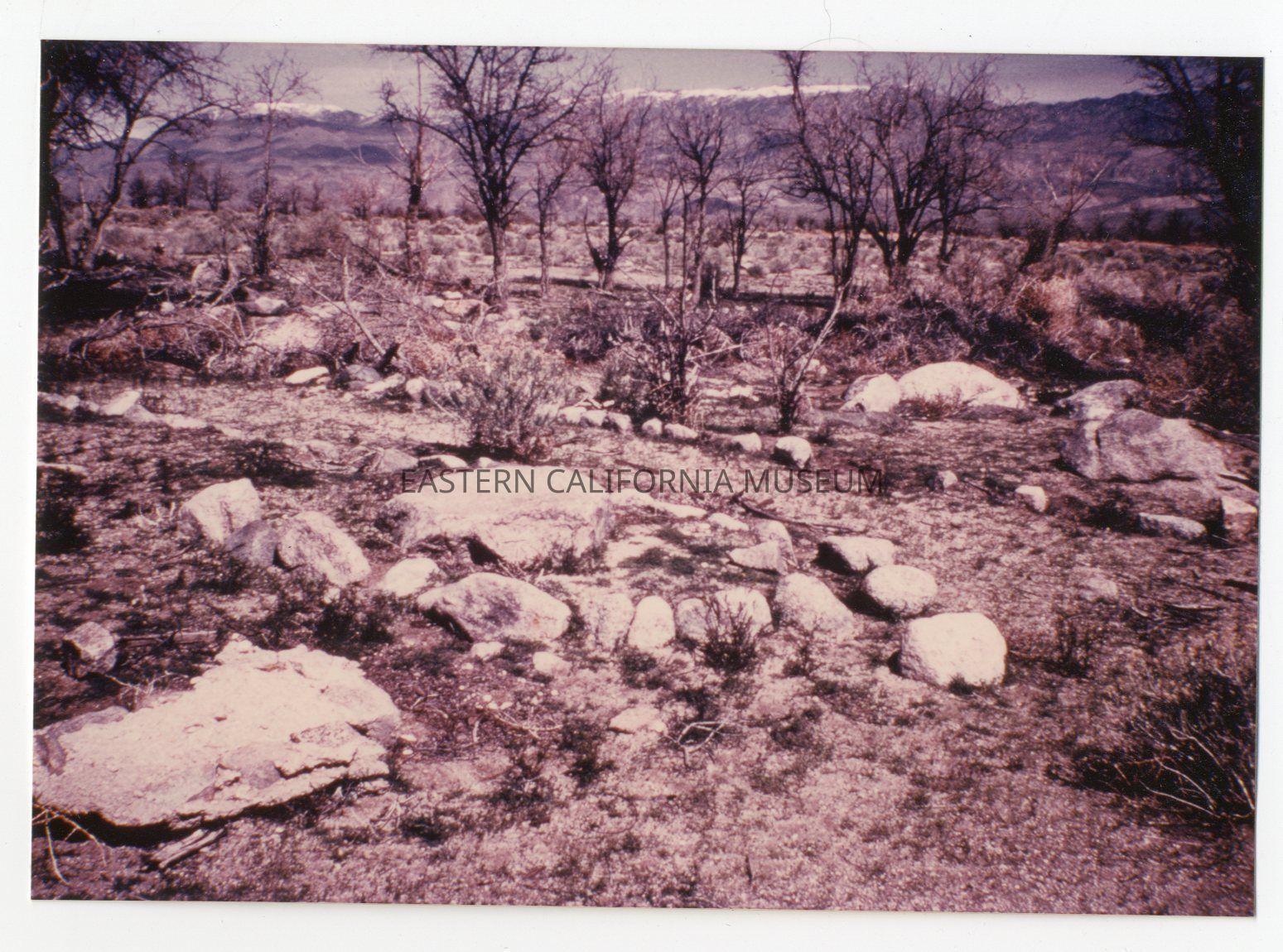 Color photo of the remains of a rock-lined pathway at Manzanar.Photograph Details