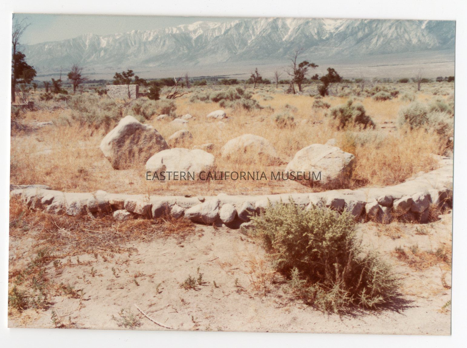Color photo of a concrete and rock lined ring at Manzanar. Could this be the remains of the planter for the joshua tree?Photograph Details