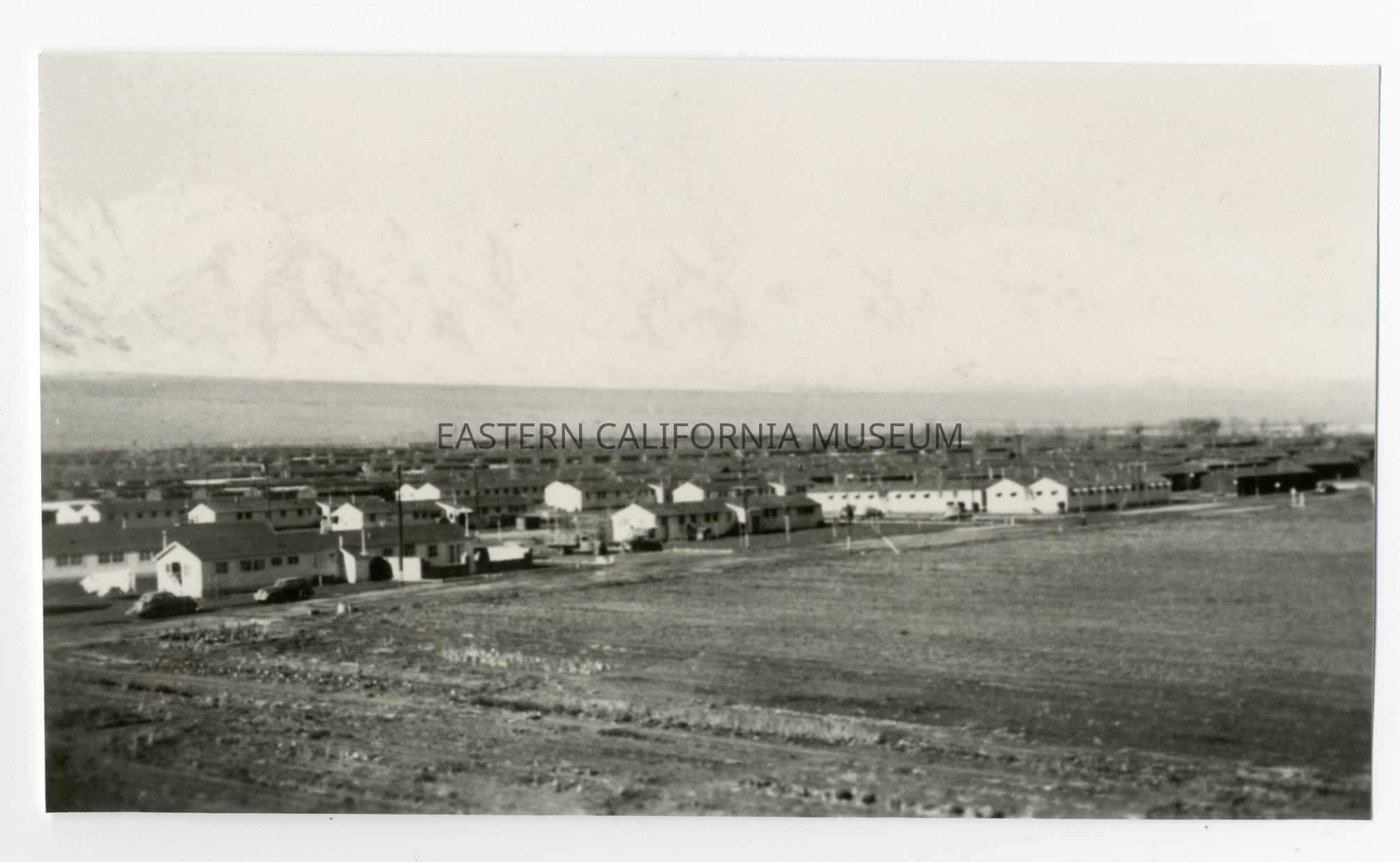 Copy of a photo of Manzanar War Relocation Center taken from a high vantage point looking west towards the Sierra Nevada mountain range. This copy was printed in March 1942.