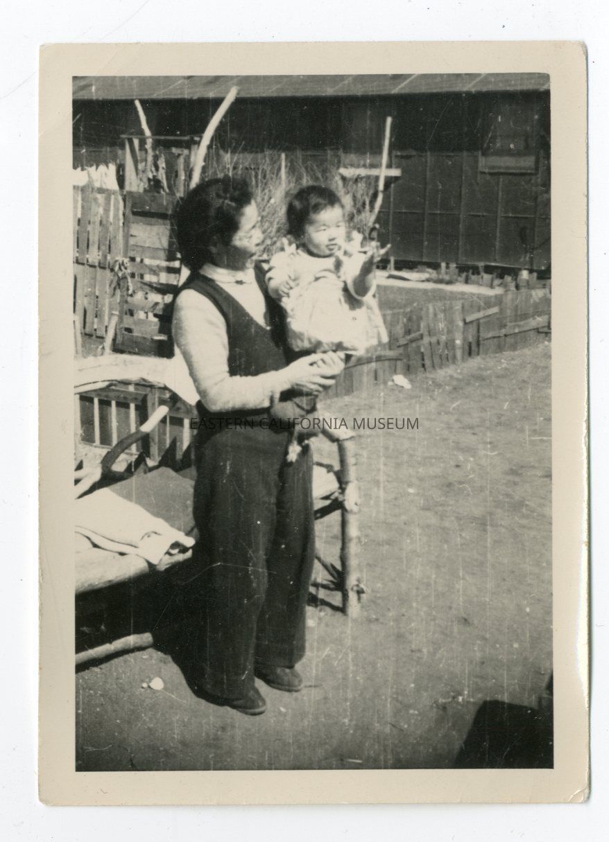 Photo of a woman holding a baby. She is standing outside in front of a bench, fence, garden, and barrack at Manzanar War Relocation Center.Photograph Details