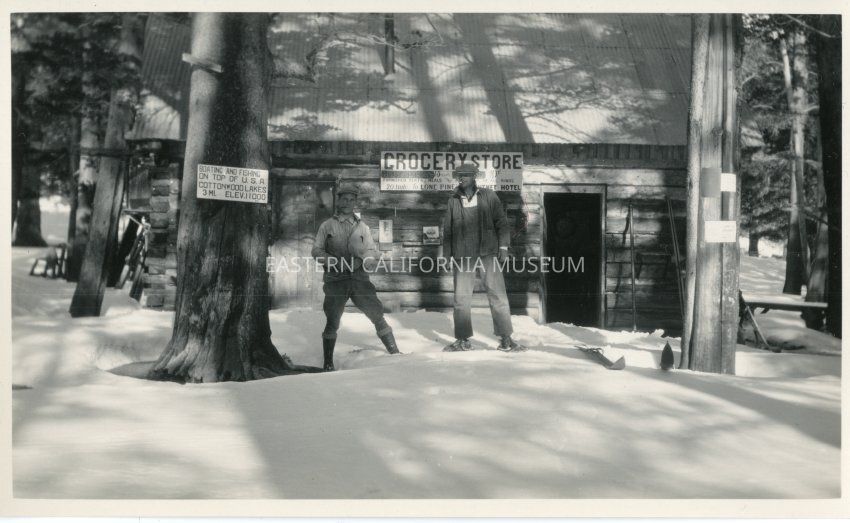 Two members of the Cottonwood Creek Snow Survey standing in front of Golden Trout Camp Store, 1926. Signs posted on tree say, "Boating and fishing on top of the USA" and "Cottonwood Lakes 3 mi., elev. 11,000." The sign on the building says, "Grocery Store, Horse Pasture 15 cents, Furnished Tents and Meals, 20 miles to Lone Pine Mt. Whitney Hotel."