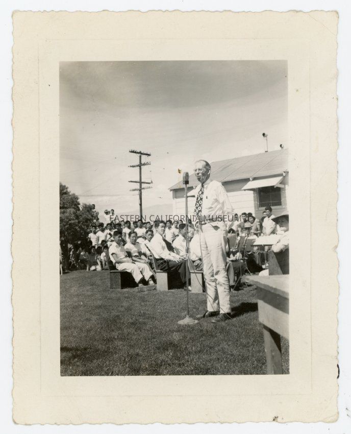 B/w photo of Ralph P. Merritt speaking into a microphone outside. Yellow sticky note identifies the speaker as Project Director Merritt.