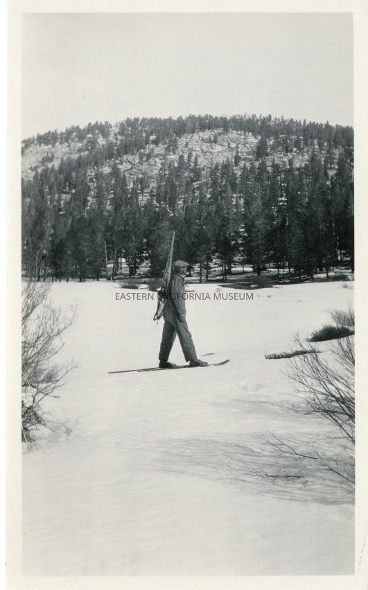 Cottonwood Creek Snow Survey team member on skis with snowshoes strapped to his back.