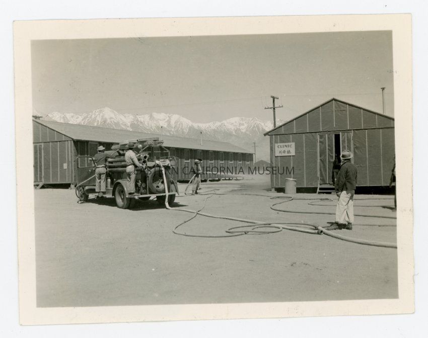 B/w photo of a firetruck, hose, and clinic at Manzanar.Photograph Details