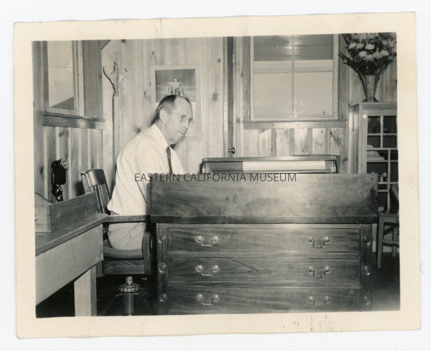 B/w photo of Ralph P. Merritt, Project Director, at his desk. Label says: Office No. 1.Photograph Details