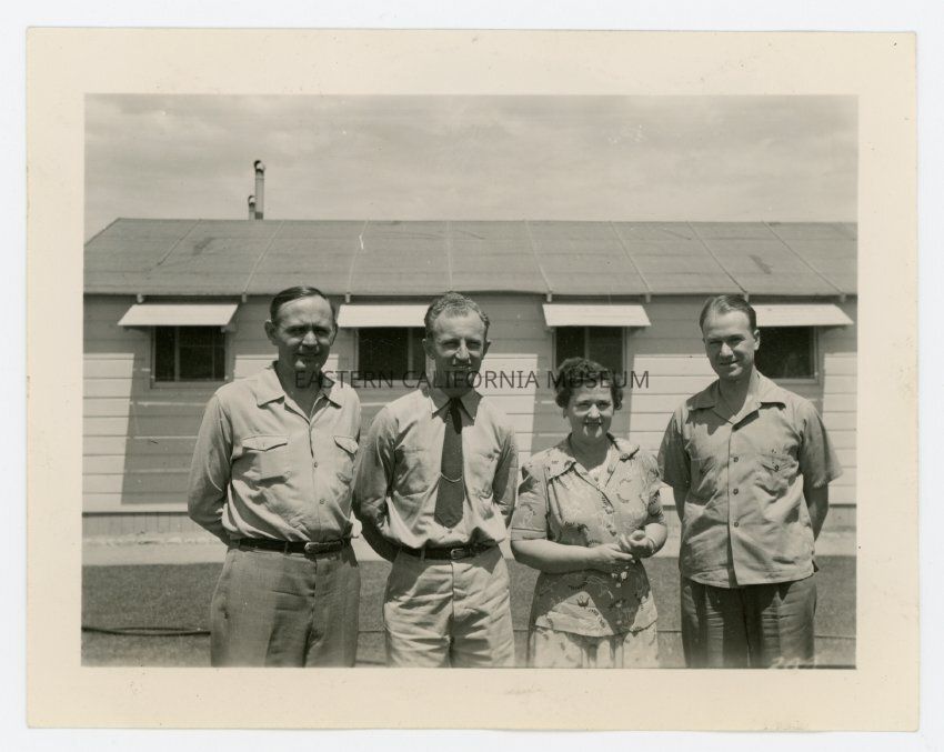 B/w photo of three men and a woman standing outside of a barrack (caucasian quarters?). Label says: His assistants: Edwin H. Hooper, Ass't. Proj. Dir. In Charge of Administrative Management; Robert L. Brown, Ass't. Proj. Dir. In Charge of Operations; Lucy W. Adams, Ass't. Proj. Dir. in Charge of Community Management; Robert Throckmorton, Project Attorney.Photograph Details
