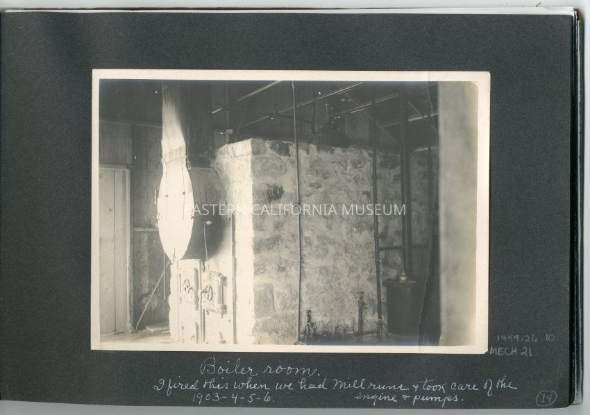 Caption on album page: Boiler room. I fired this when we had mill runs and took care of the engine and pumps. 1903-4-5-6 [1903-1906].Collection