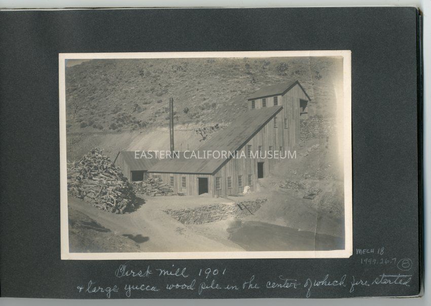 Caption on album page: First mill 1901 and large yucca wood pile in the center of which fire started.Collection