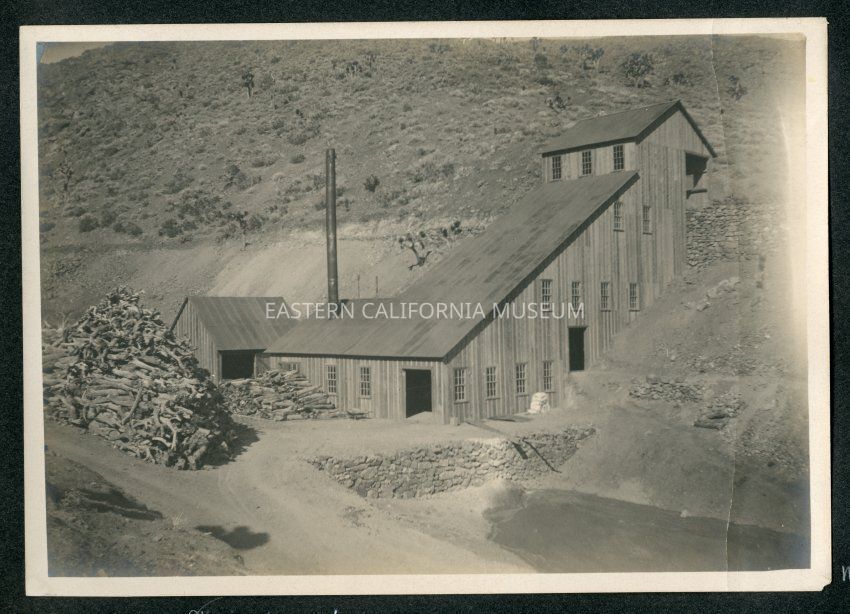 Photo of the mill at Millspaugh mining camp with a large pile of stacked yucca trees beside it.