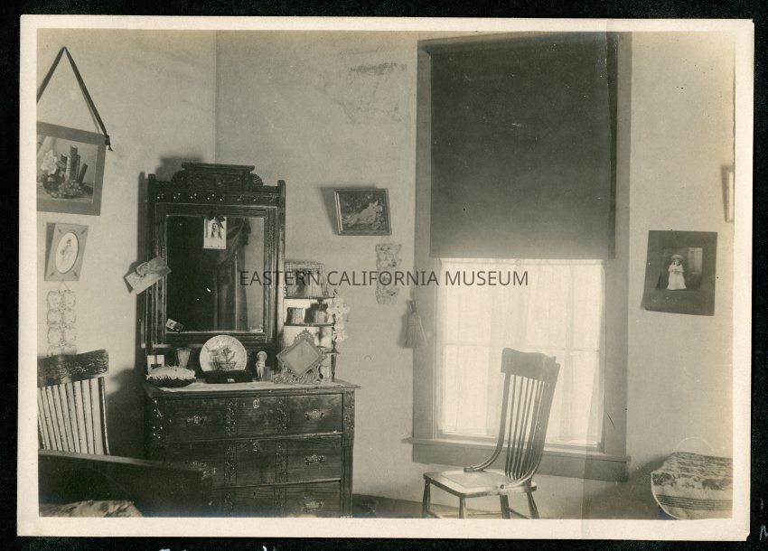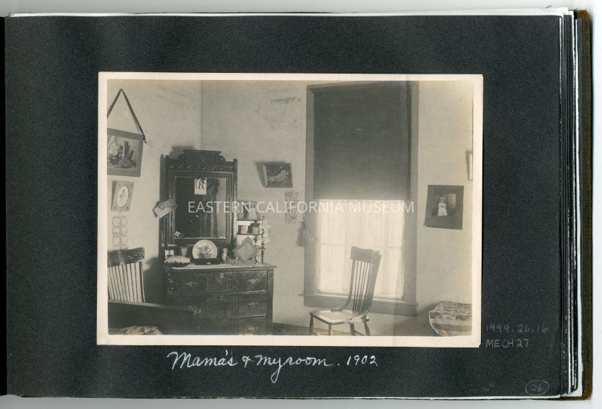 Interior photo of a home at Millspaugh. Caption on album page: Mama's and my room, 1902.