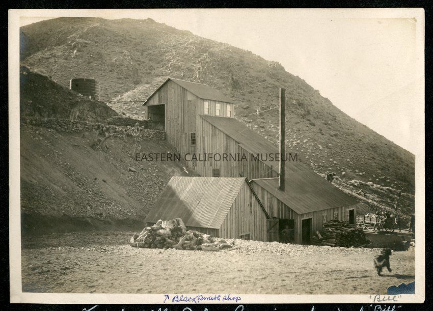 Photo of the Millspaugh mill. Written in ink along the bottom edge of the photo: blacksmith shop and "Bill."